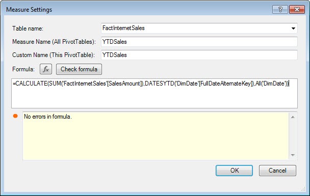 As soon as you hit OK it will apply it to the PivotTable. Make sure the formula is working by adding CalendarYear and CalendarQuarter on Row Labels and SalesAmount to the Values section.