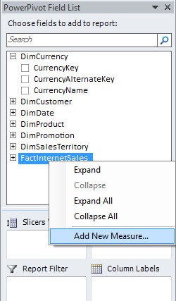 So far I have shown you calculated columns, but how do you create calculated measures? Calculated measures are actually created while viewing the PowerPivot data in a PivotTable. To do this, click the PivotTable drop down on the Home tab in the PowerPivot Window. Select PivotTable from the dropdown and then click OK when the Create PivotTable box opens. In the PowerPivot Field List pane right click on the FactInternetSales table and choose Add New Measure.