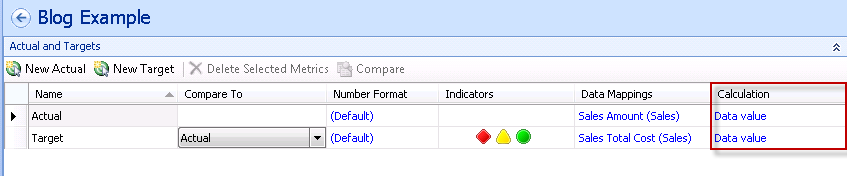 Once the Drillthrough is setup properly in SSAS then you must build your PerformancePoint KPI so it will pickup the action. This means that in Dashboard Designer you must change the Calculation property on each field on your KPI that you wish to allow users to launch the action must be set to Data value. This is a change in the property value name which was called Source data in PPS 2007.