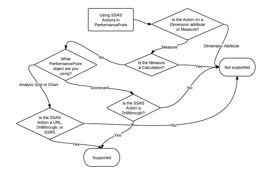 I mentioned there are a lot of caveats to doing actions in PerformancePoint so I came up with this quick flowchart to first see if you can even consider doing them.