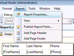 What I’d like to do is format all the phone numbers to look like this (###)###-####. This could easily be accomplished with some custom code. To add custom code in Reporting Services select the Report->Report Properties menu.