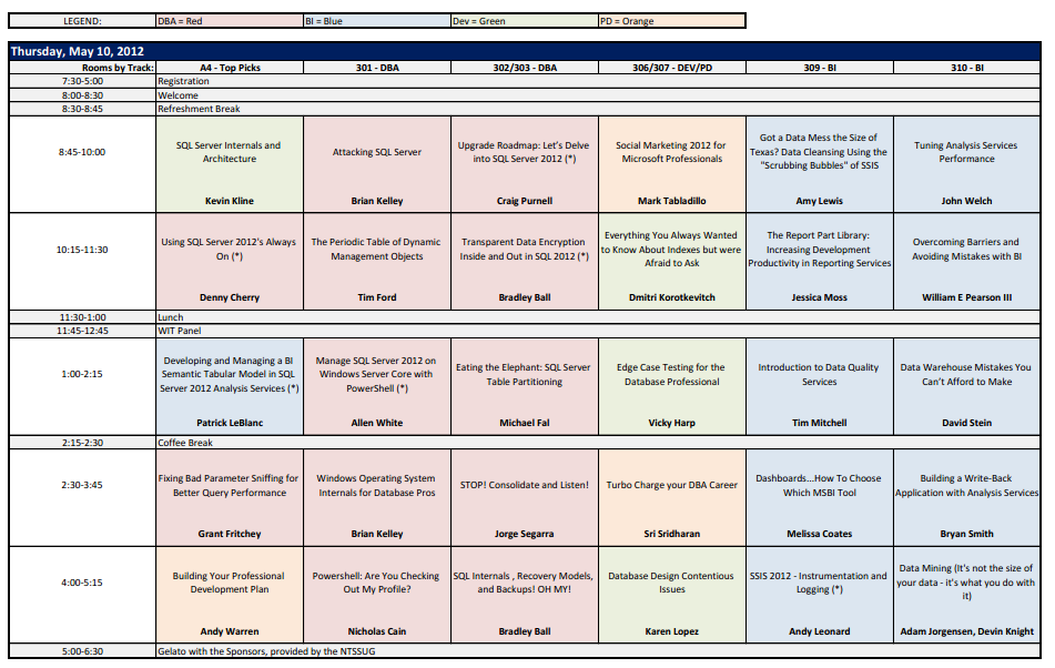 In case you didn’t see the email come through for PASS this week the SQL Rally schedule is now available. The event will be in Dallas May 10-11 with lots of great session so be sure to check it out. Here’s a link to the PDF or I’ve included screenshots here of each day. You can also build you schedule now here.