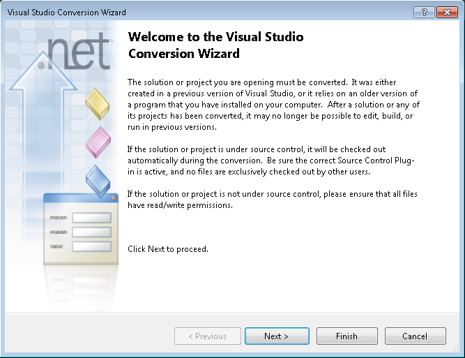 To get started open your old SSIS solution in SQL Server Data Tools (new name for BIDS), which will automatically launch a conversion wizard. This conversion wizard actually does two conversions. The first conversion is more of a Visual Studio upgrade and the second specific to SSIS. The screenshot below shows the start of the VS upgrade, click Next past the welcome screen.