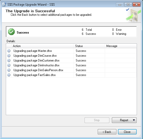 A successful conversion should look similar to the below image. Hit Close, which will end the SSIS upgrade wizard and return you back to the final step of the Visual Studio upgrade.