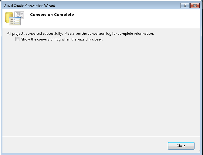 You are returned to the Visual Studio upgrade where you simply need to hit Close to complete the upgrade.