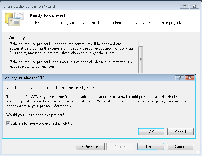 Prior to starting the SSIS Conversion tool you’ll get a warning to ensure the SSIS project is coming from a trusted source so you don’t risk a security threat. Keep in mind the Visual Studio wizard stays open in the background.