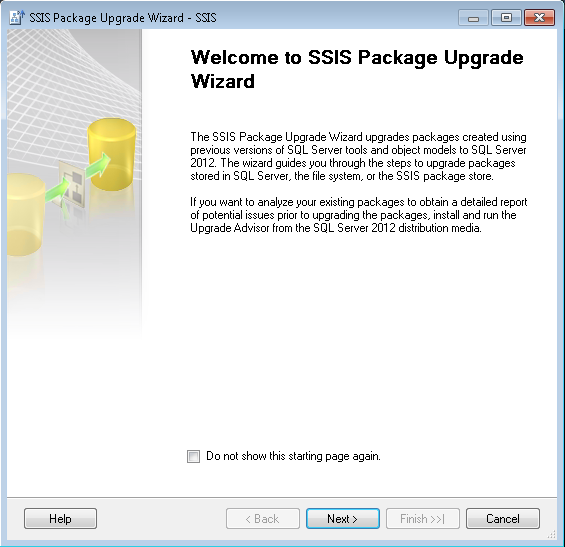 Click Next past the welcome screen of the SSIS upgrade wizard.