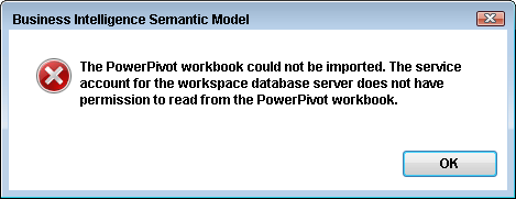 Error: The PowerPivot workbook could not be imported. The service account for the workspace database server does not have permission to read from the PowerPivot workbook.