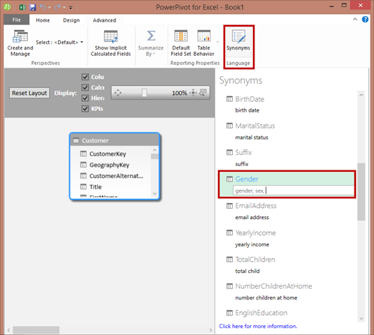 A little gem was included with the latest Office 365 update. After downloading and installing this update you will now find that a feature called Synonyms is available inside Power Pivot.