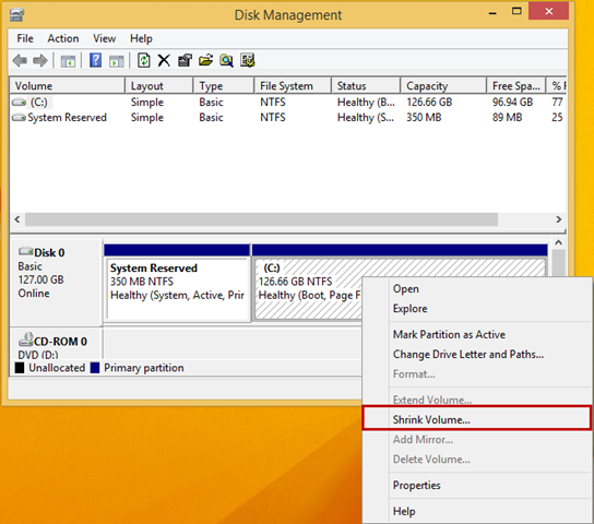 • Right-click on the volume you wish to shrink and select Shrink Volume.