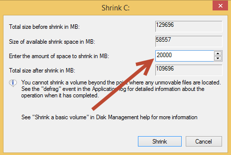 • Carefully fill out the property called Enter the amount of space to shrink in MB. I say carefully because it is easy to assume that this number is what you want to new disk size to be, but in reality this is the size to reduce your disk by.