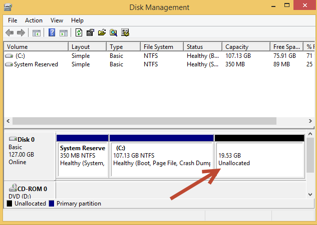 • Launch the Disk Management utility by doing a Run diskmgmt.msc.