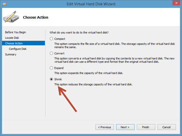 • Now that we’ve created the extra disk space on the volume inside the virtual machine you can select Shrink here. If you look back to the third screenshot of this blog you’ll notice the Shrink option was not available. It took us first reducing the volume of the disk inside the VM to make this appear.  Select Shrink then click Next.