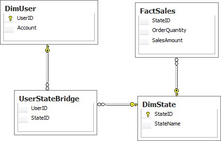 FactSales is storing all the company sales, while DimState has all the possible distinct states that sales can occur in. This is a very small scale example, but here’s in detail what DimUser and UserStateBridge tables store: