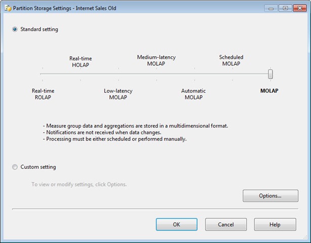 | Medium Latency MOLAP | · Same as MOLAP but updates in the relational database will trigger a switch to Real-time ROLAP while cube is processing. When cube completes processing returns back to MOLAP. Default latency is 4 hours. |