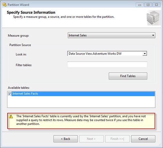 Remember all measure groups have at least one partition by default. Before creating a new partition you must first change the old partition to restrict what rows are brought back. If you don’t do this before trying to create a new partition you will get the following warning: