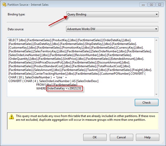 · When you change this property to Query Binding you will see that it automatically provides you the query that will return back the table with a blank WHERE clause at the end. Remember we want to have a partition with all data prior to 2003 so the WHERE clause needs to be changed to only return data prior to that date (Ex. WHERE OrderDateKey <= 20021231). Once the query has been changed hit OK.