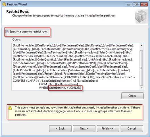 · Check the box the reads Specify a query to restrict rows and add to the WHERE clause like you did in step one to bring back all the dates after 2002 (WHERE OrderDateKey > 20021231). Be very careful when writing these WHERE clauses. If you accidently did >= instead on > then there would be overlapping sales data for 20021231. I could also accidently exclude a day if on the first partition I used < and the second partition >. This would exclude one days worth of data from my measure group. On the bottom of the dialog box you will see a warning describing the possibility of overlap and missing days. Hit Next when you finish typing the query.