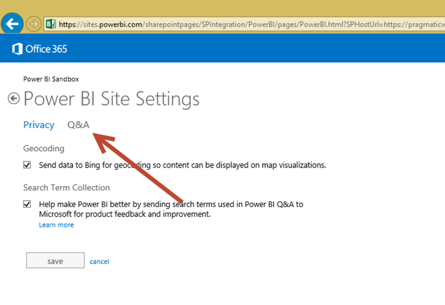 Once the workbook is in Power BI you’ll go to the Power BI Site Setting page as shown below. This is also where you will go to configure Phrasing, that we’ll discuss later.