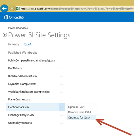 Then find your workbook and click the ellipsis next to it. Select Optimize for Q&A to launch the Cloud Modeling window.