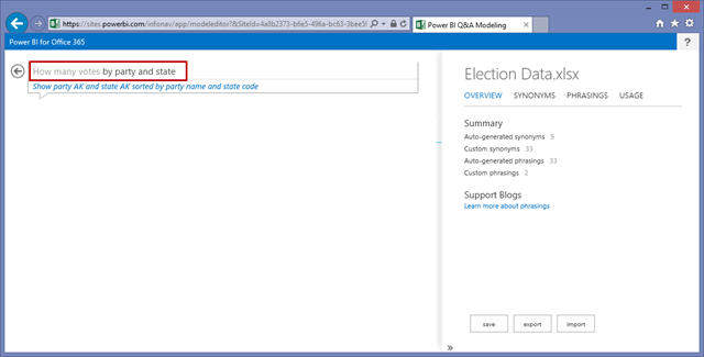 You should create synonyms on your tables and columns for the different ways that people would ask for your data. For example, in my question “How many votes by party and state” I would need to create the following synonyms in my data model: