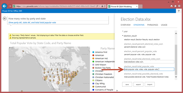 To solve our first problem with the question “How many votes by party and state” we would need to create synonyms on the appropriate columns in your data model. Synonyms are like aliases that can be created for both tables and columns inside your Power Pivot data model.