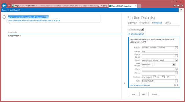 Phrasing can only be done from the Cloud Modeling pane (Not Excel) on the Power BI site that we just looked at in the previous example. So from the Cloud Modeling pane I’ll click Phrasing and ask the question ”Which candidate won the election”.