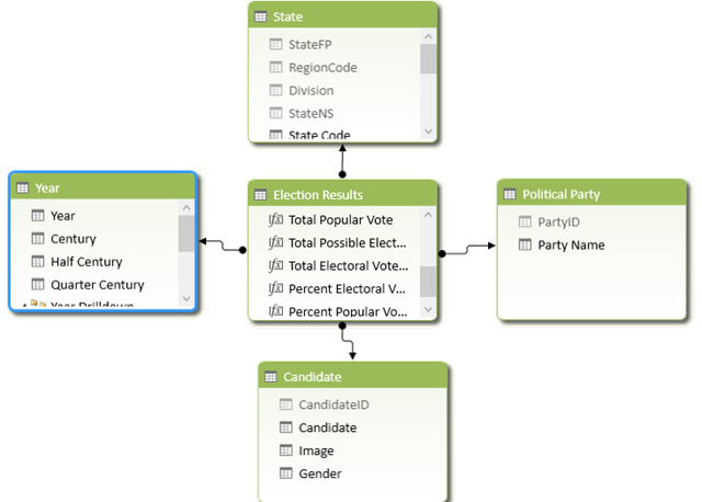 This data model is designed to show US Presidential Election data. When this is added to Power BI Q&A users will likely ask questions like “How many votes by party and state” or “Which candidate won the election”.