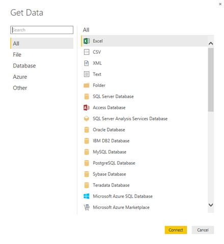 In the Power BI Desktop application this story becomes much more simple. The one and only way to import data starts with Power Query.  By selecting Get Data in Power BI Desktop you’re presented with a very large (yet continuing to grow) list of data sources that you can use for importing data.