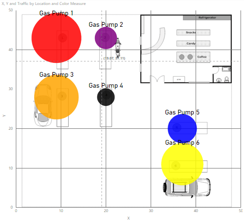 1. The size of the bubble should be relative to the number of customers you have. Do most stores have roughly the same number of customer except for that one outlier?