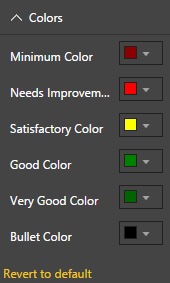 - The Colors settings allow you to adjust the colors that are used for each threshold of the Bullet Chart. Pretty straightforward but it’s nice that you have the flexibility to change these thresholds.