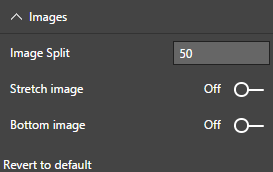 - The Image Split property allows you to adjust the percentage of the space that the image takes up in its space. So if you set this to 100 then the image would take 100% of the space it is provided.