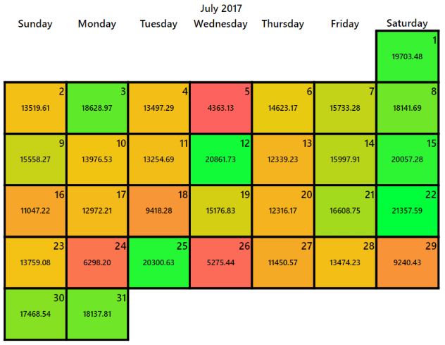 This Beyondsoft Calendar displays sales that occurred in the month of July.