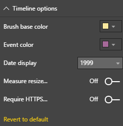- In the Timeline options section you can change the color of the event dots (if you’re not using images) and the time brush. You can also adjust the format of the date being displayed. In this case I’ve only displayed the year out of the date.