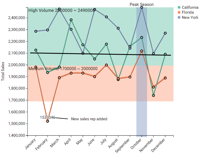 This ChartAccent – LineChart shows sales for California, Florida and New York with annotations on key areas of the data.