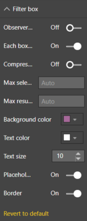 - The Filter Box section contains the majority of the settings for this visual. Here you can change this slicer to just display values rather than filter using the Observer mode. You can also change the appearance of this visual from this section.
