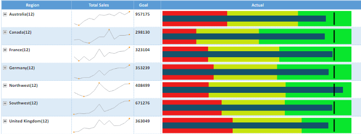 This MicroChart example shows the total sales by region in a line chart with a bullet chart displaying those regions that reached their goal.